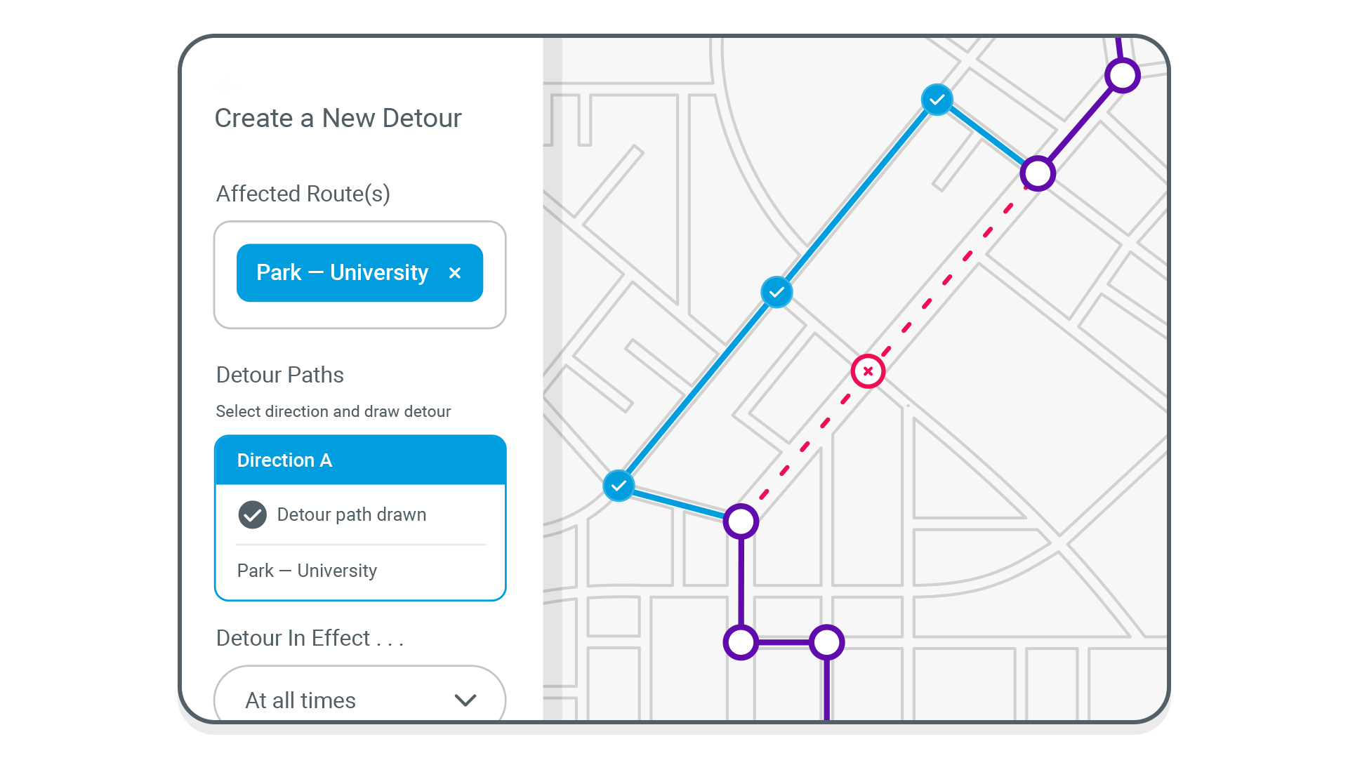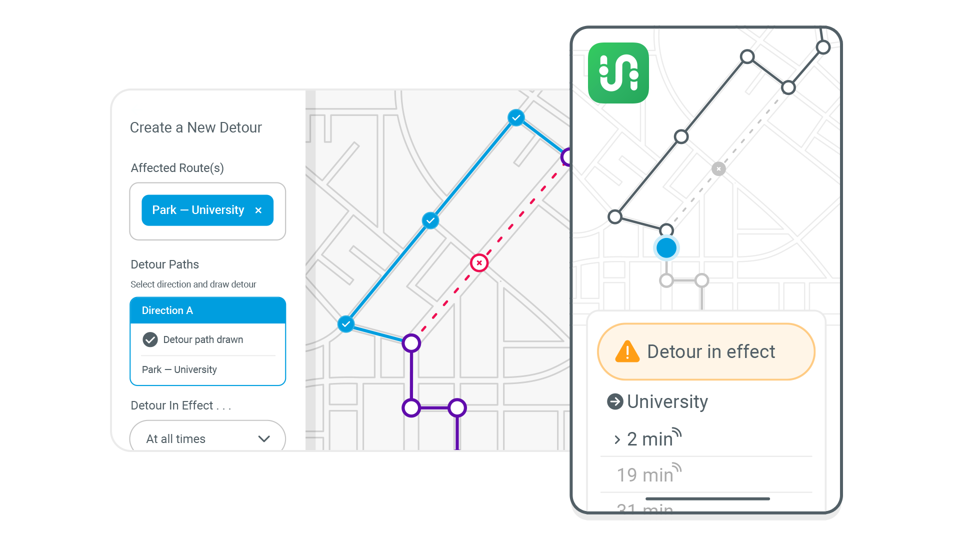Adjusting service no longer requires manually updating spreadsheets across multiple tabs or systems. Dispatchers simply adjust service in Swiftly—enacting detours, closing stops, or making other ad hoc changes to service—and all downstream information updates automatically. Vehicle predictions, rider alerts, driver displays, and onboard systems all update instantly and in a single stroke.